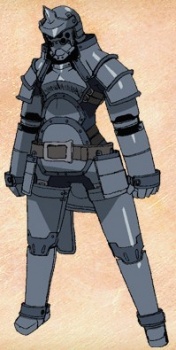 A member of Neeba's party. Encased in armour, he is the main attacker of the group, and he wields a battle axe. While the mask of his helm has been lifted twice so far in the series, it has always been at an angle that denies the audience the chance to see his face, thus leaving his appearence and age unknown. When the group becomes seperated, he travels with Kally and Coopa, but becomes seperated from Kally when protecting Coopa.