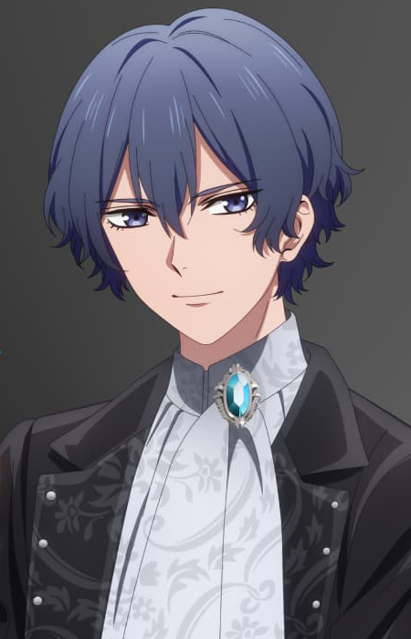 Ayumu is a man of average height with short dark blue hair thats wavy at the tips, with bangs framing his face as well as some falling between his eyes, with similarly colored eyes and long eyelashes.